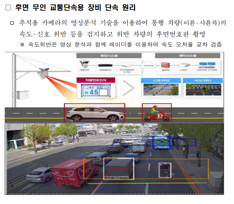 기존 과속 카메라는 전면 번호판만 기록하고 속도 기준을 측정하고 평가합니다. AI 기반 영상 분석으로 번호판뿐 아니라 헬멧 착용 신호 위반도 추적 가능해야 한다.