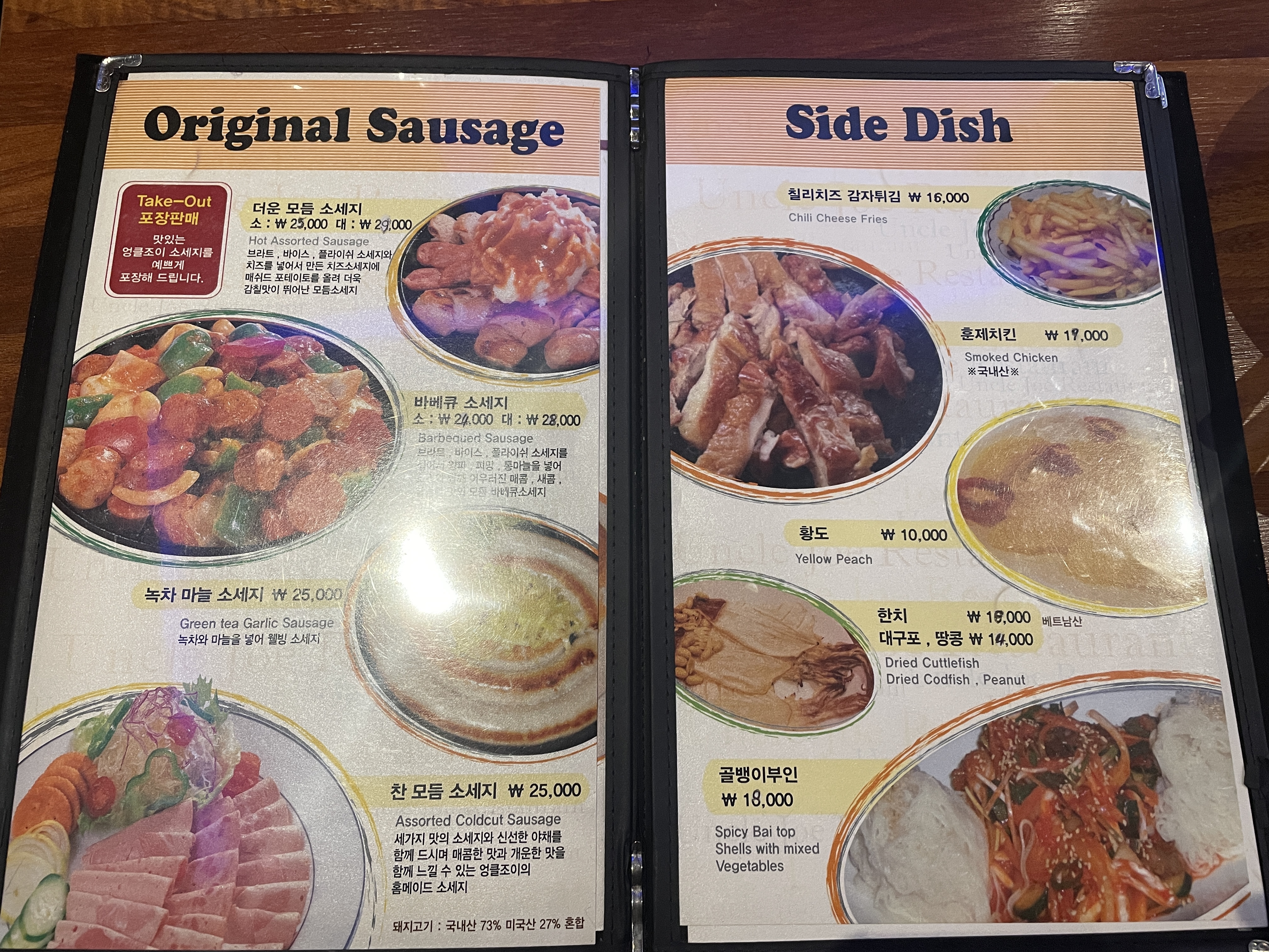 메뉴판입니다. 참고로 소시지도 포장 가능합니다. 모듬 소시지는 핫과 콜드의 두 가지 버전으로 제공됩니다. 바비큐 소시지, 녹차 마늘 소시지 등이 있으며, 그 외 반찬으로는 성게, 치킨, 감자튀김, 갈치 등이 있다. 맥주안주로 먹기 좋은 안주가 많아서 서너명이서 이것저것 먹기도 좋다.