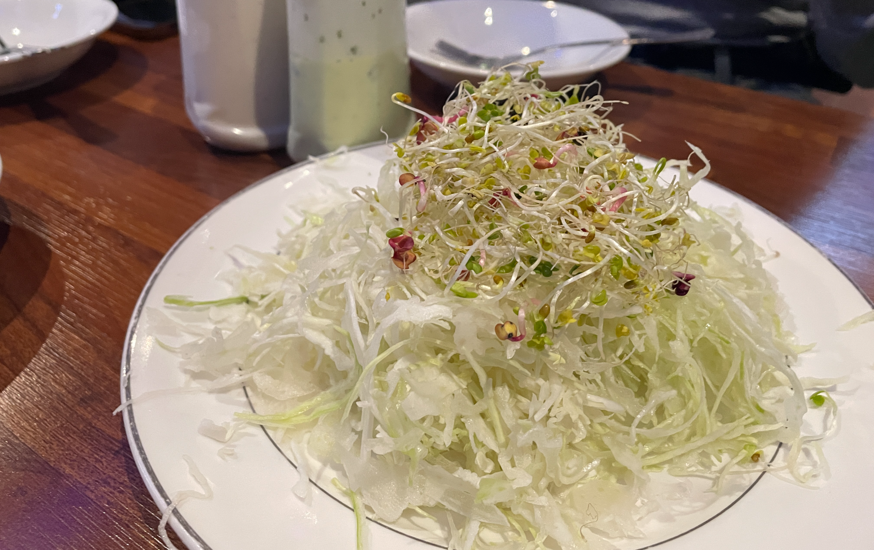 소시지를 계속 먹으면 배가 아파서 양배추 샐러드로 낸다. 드레싱은 와사비 마요와 마요 두 종류를 줍니다. 개인적으로 양배추만 먹어도 괜찮았습니다. 남들은 짜고 고기가 많아서 배추만 먹어도 깔끔했다.