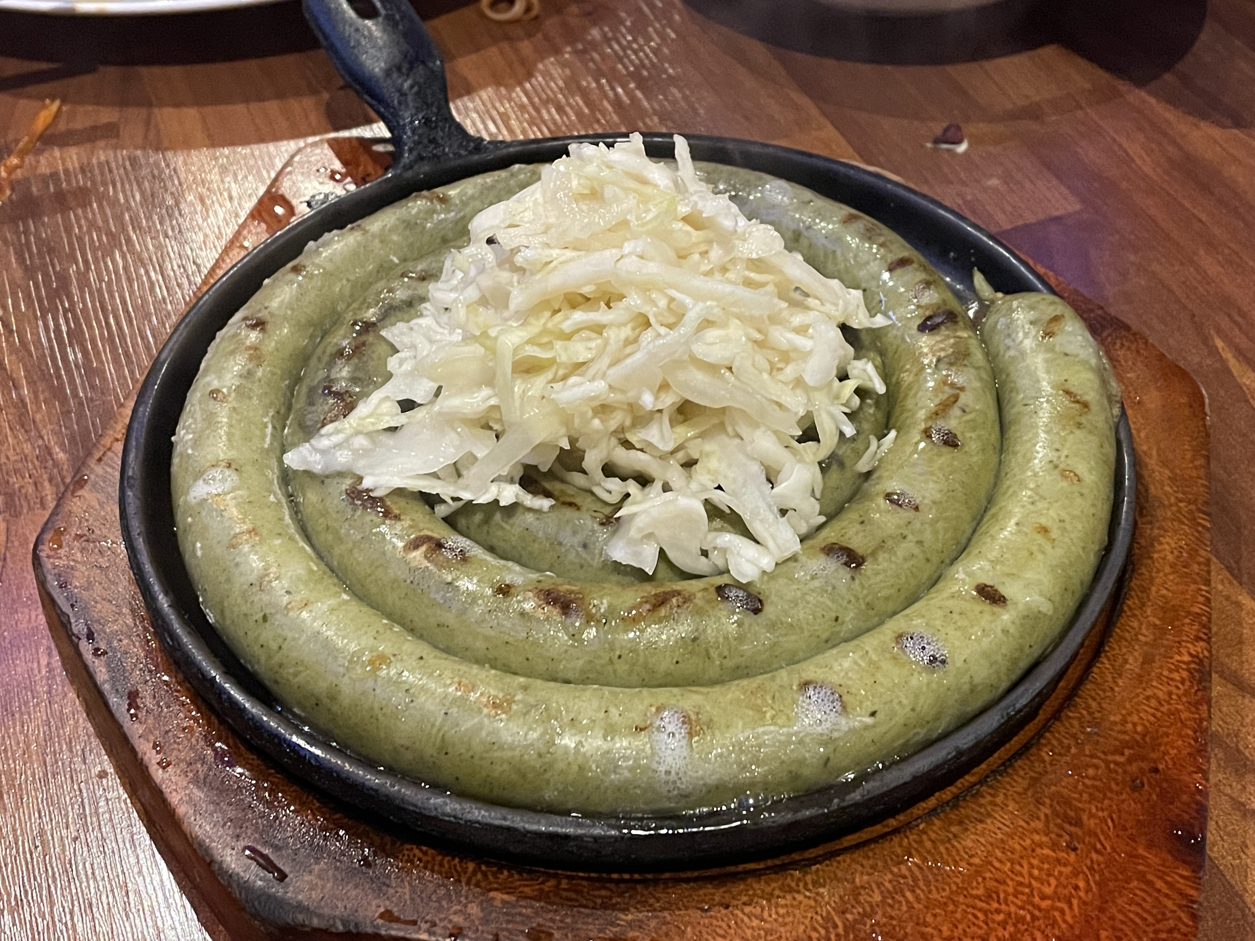 나는 먹지 않고 다른 소시지를 주문했습니다. 녹차 마늘 소시지. 색깔이 살짝 초록빛이 도는건 말할것도 없이 녹차소세지 같네요. 소시지를 먹었을 때 녹차 맛도 굉장히 강했다.