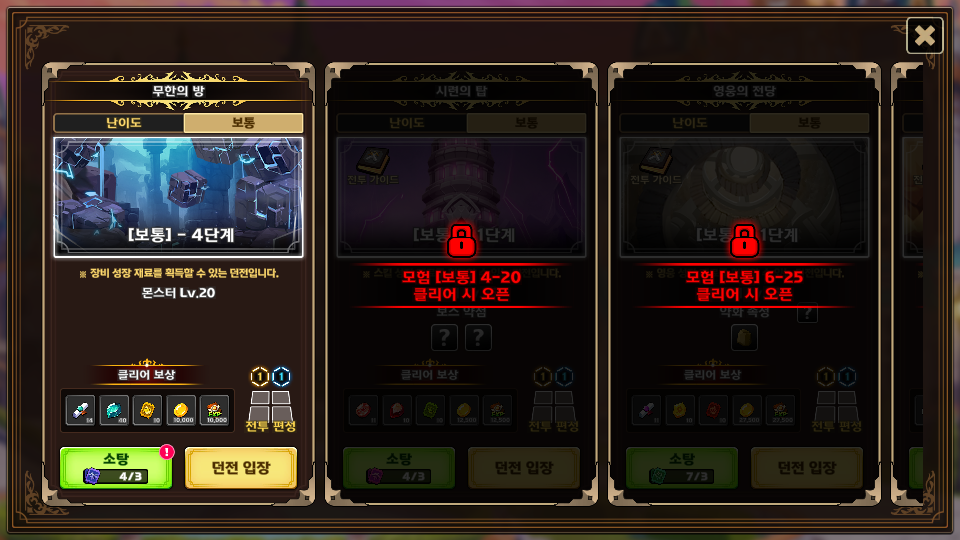 특정 스테이지의 모험을 클리어하면 던전이 활성화됩니다. 어드벤처 보통 난이도 8~30(무한의 방 / 시련의 탑 / 영웅의 전당 / 용의 협곡)을 클리어하면 추가 콘텐츠를 이용할 수 있습니다.