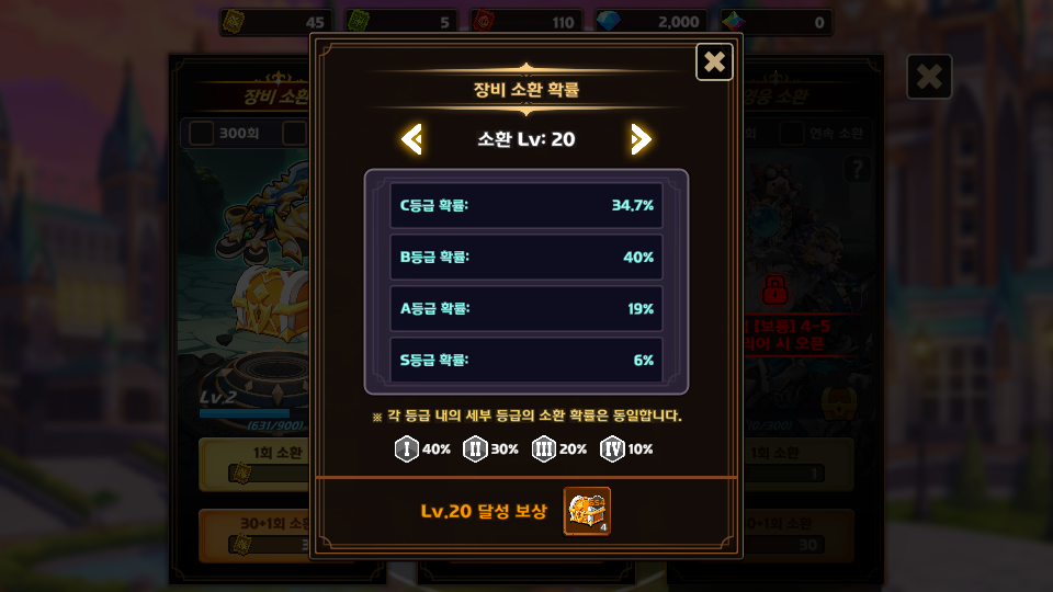 소환 레벨 1에서는 B등급 장비까지 나오지만, 소환 레벨 20에서는 S등급 장비를 6% 확률로 획득할 수 있다. 결과적으로 SS 또는 R 등급은 S 등급 이하의 장비를 업그레이드해야만 얻을 수 있습니다.